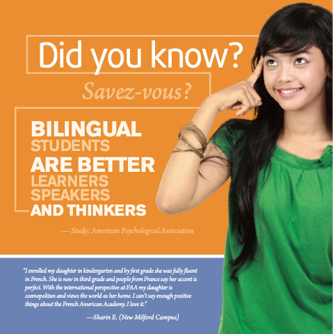 “I enrolled my daughter in kindergarten and by first grade she was fully fluent in French. She is now in third grade and people from France say her accent is perfect. With the international perspective at FAA my daughter is cosmopolitan and views the world as her home. I can’t say enough positive things about the French American Academy. I love it.”